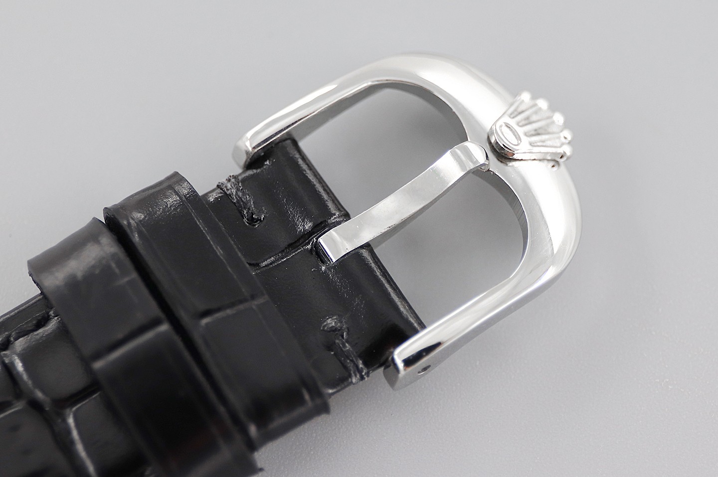 Rolex Cellini Date 50519 Black Leather Black Dial 39mm Mens Watch has a white Gold 39 mm Round Case with Screw Down Crown and a White Gold Bezel.Scratch resistant sapphire crystal.Black sunburst guilloche dial with raised polished baton hour markers. Fine printed minute/seconds track. Date subdial at 3 o''clock aperture. Black Leather Bracelet will look great on your wrist with white gold tang buckle.
