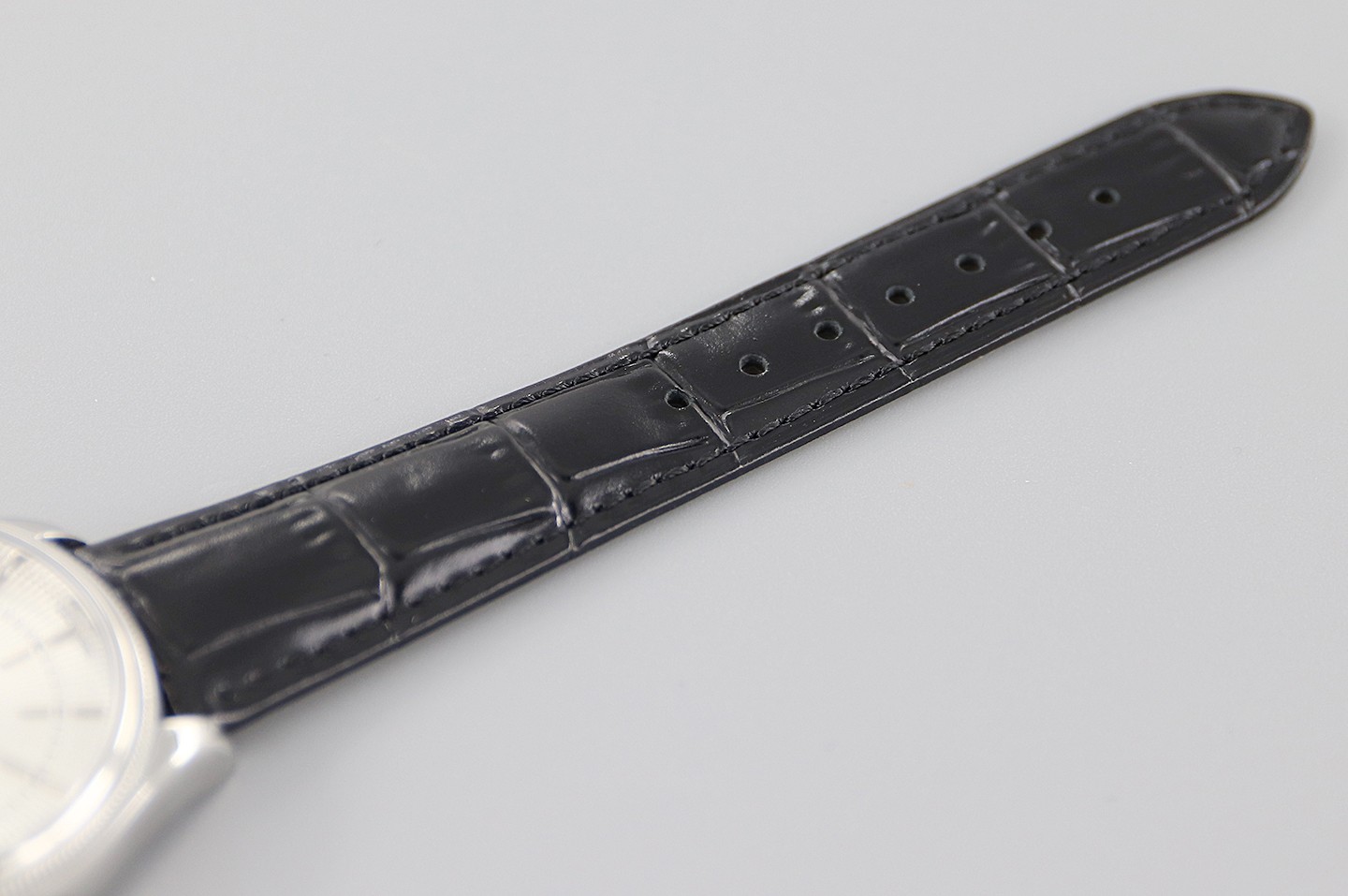 Rolex Cellini Date 50519 Black Leather Silver Dial 39mm Mens Watch has a white Gold 39 mm Round Case with Screw Down Crown and a White Gold Bezel.Scratch resistant sapphire crystal.Silver sunburst guilloche dial with raised polished baton hour markers. Fine printed minute/seconds track. Date subdial at 3 o''clock aperture. Black Leather Bracelet will look great on your wrist with white gold tang buckle.