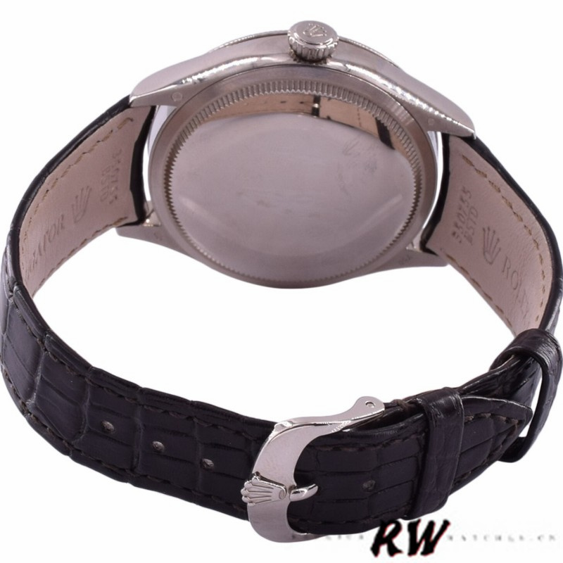 Rolex Cellini Date 50519 Brown Leather Silver Dial 39mm Mens Watch has a white Gold 39 mm Round Case with Screw Down Crown and a White Gold Bezel.Scratch resistant sapphire crystal.Silver sunburst guilloche dial with raised polished baton hour markers. Fine printed minute/seconds track. Date subdial at 3 o''clock aperture. Brown Leather Bracelet will look great on your wrist with white gold tang buckle.