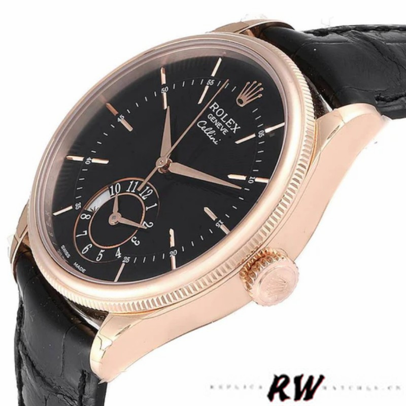 Rolex Cellini Dual Time 50525 Black Dial Black Leather Strap 39mm Mens Watch,39mm rose gold round case in diameter.Scratch resistant sapphire crystal. Black sunburst guilloche dial with raised polished white gold baton hour markers. Fine printed minute/seconds track. Centre hour, minute and seconds white gold hands. Second time zone at 6 o'clock with day/night indicator. Black alligator strap with rose gold tang buckle.