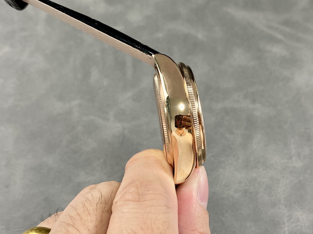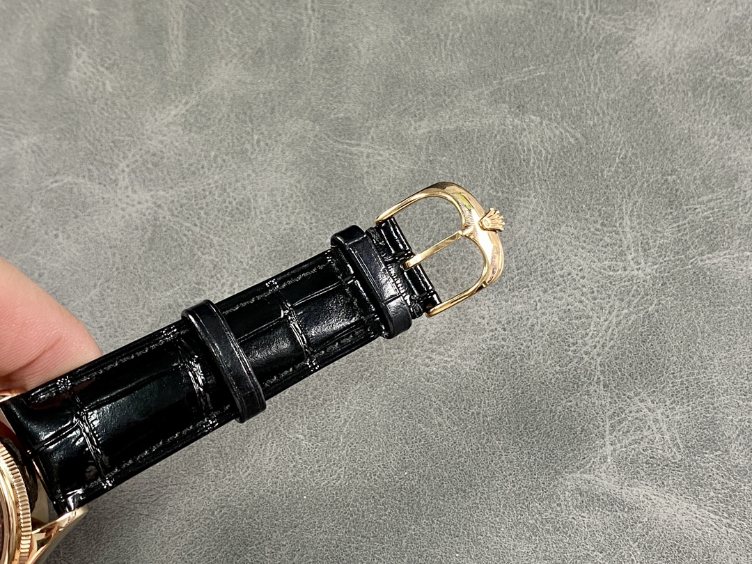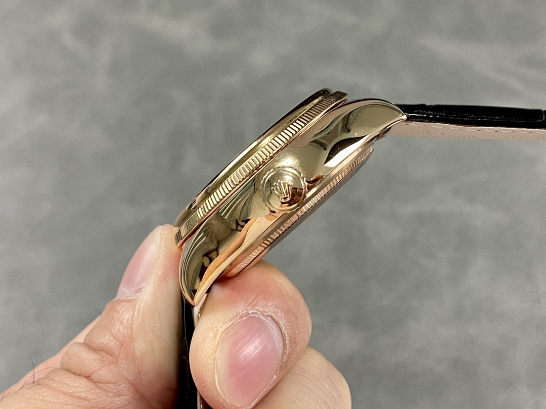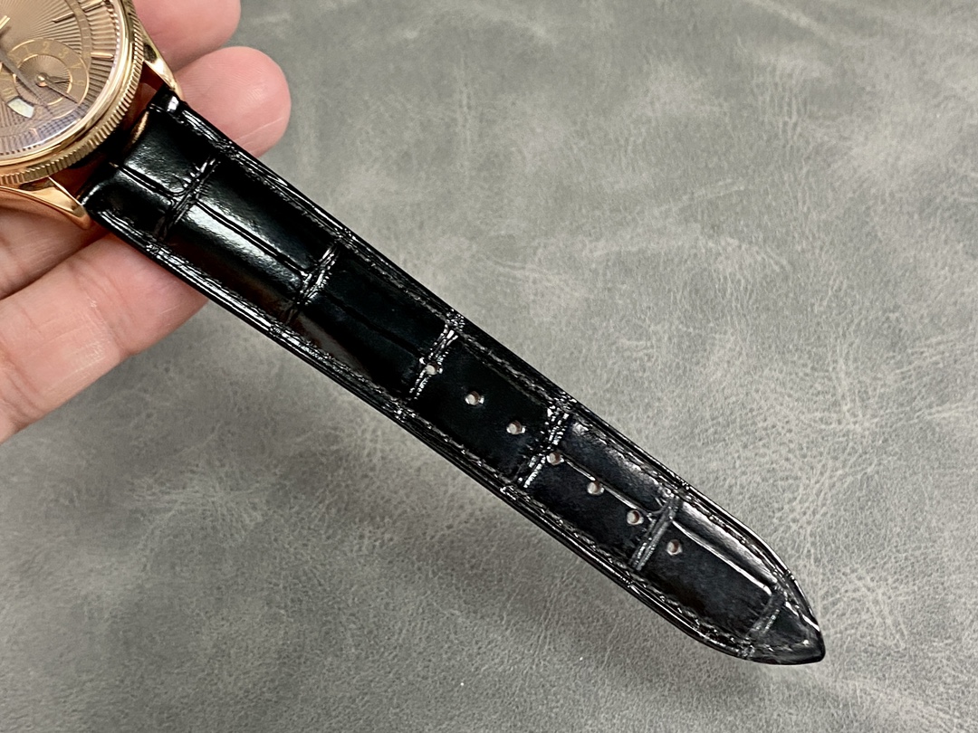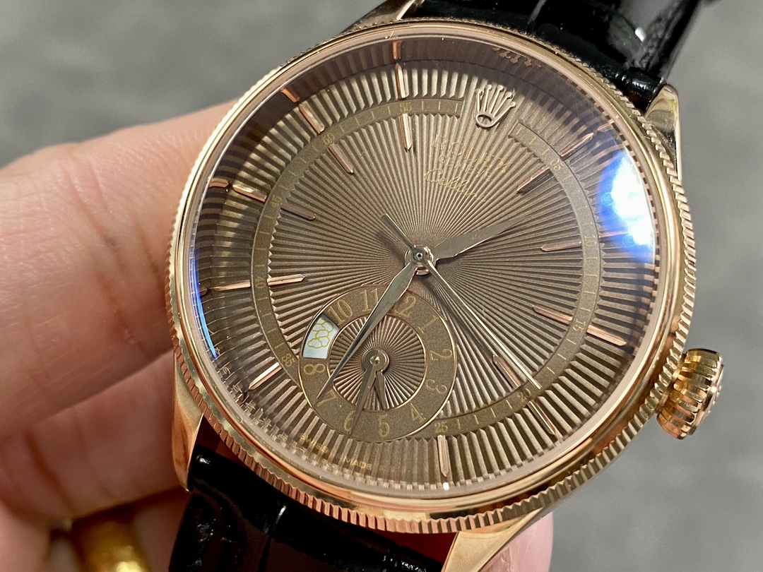 Rolex Cellini Dual Time 50525 Brown Guilloche Dial Black Leather Strap 39mm Mens Watch , 39mm Everose case, flared screw-down crown, double domed and fluted bezel, domed sapphire crystal, brown guilloche dial, Everose gold index hour markers, Second time zone at 6 o'clock with day/night indicator, Shiny black alligator leather strap with Everose gold buckle.