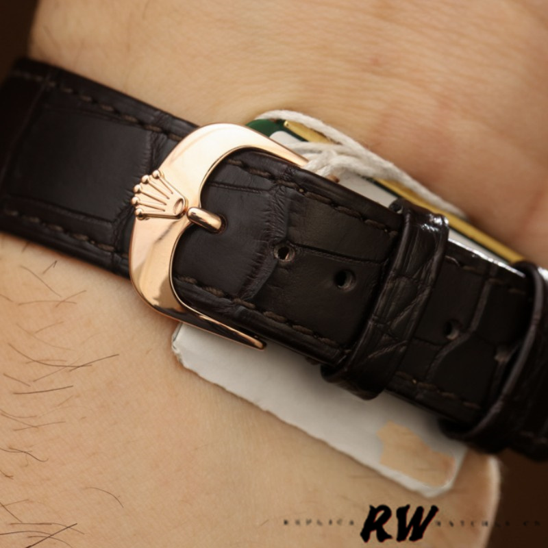 Rolex Cellini Time 50505 Brown Leather Strap White Dial 39mm Mens Watch,39mm rose gold round case in diameter.Polished solid everose gold domed and fluted fixed double bezel.Scratch resistant sapphire crystal. White dial with raised polished rose gold baton hour markers. Fine printed minute/seconds track. Centre hour, minute and seconds rose gold hands. Custom brown leather strap with rose gold tang buckle.