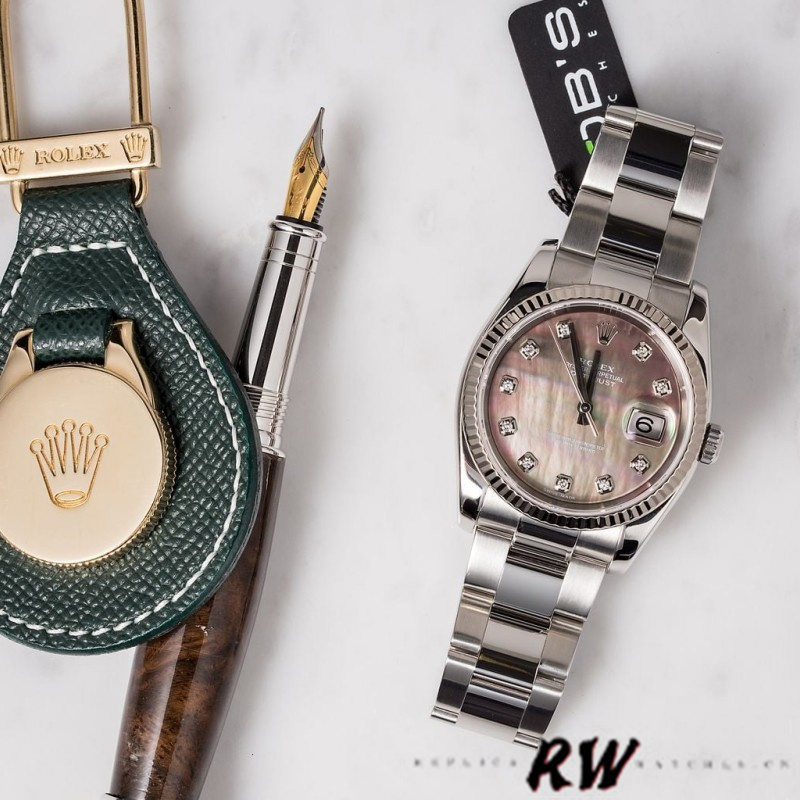 Rolex Datejust 116234 Black MOP Diamond Dial Automatic 36mm Unisex Watch.This watch will become the jewel of your luxury watch collection. Round Stainless Steel Case and Bracelet, Fixed Fluted White Gold Bezel. Black Mother-of-Pearl dial adorned with small diamonds and sweeping hands. Date Display Set at the 3 O'clock Position. Stainless steel oyster bracelet with a fold over clasp.