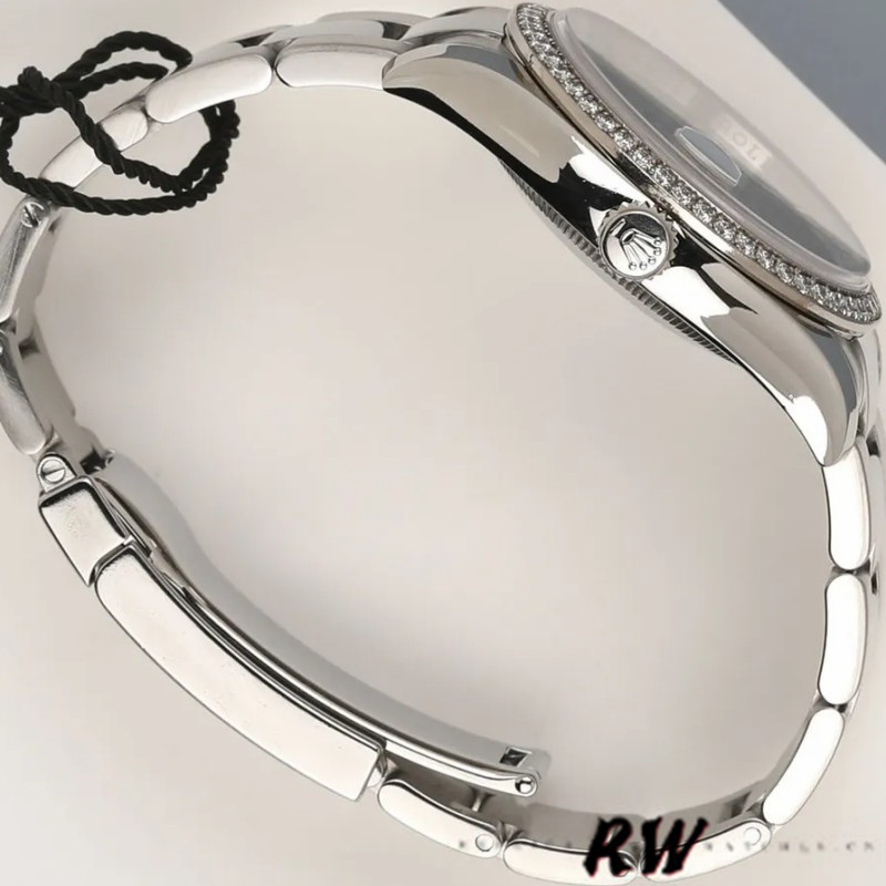 Rolex Datejust 116244 Bronze Floral Arabic Diamond Dial 36mm Unisex Watch.The 36mm diameter solid three-body case, bracelet, gently curved lugs, and white gold diamond bezel, are polished/brushed. The dial is Bronze with fine floral design and Arabic hour markers and a Rolex crown at 12 o'clock. There is an instantaneous date aperture window at 3 o'clock with a magnified cyclops lens. Scratch-Resistant Sapphire Crystal, Screw-Down Crown with Twinlock Double Waterproofness System.