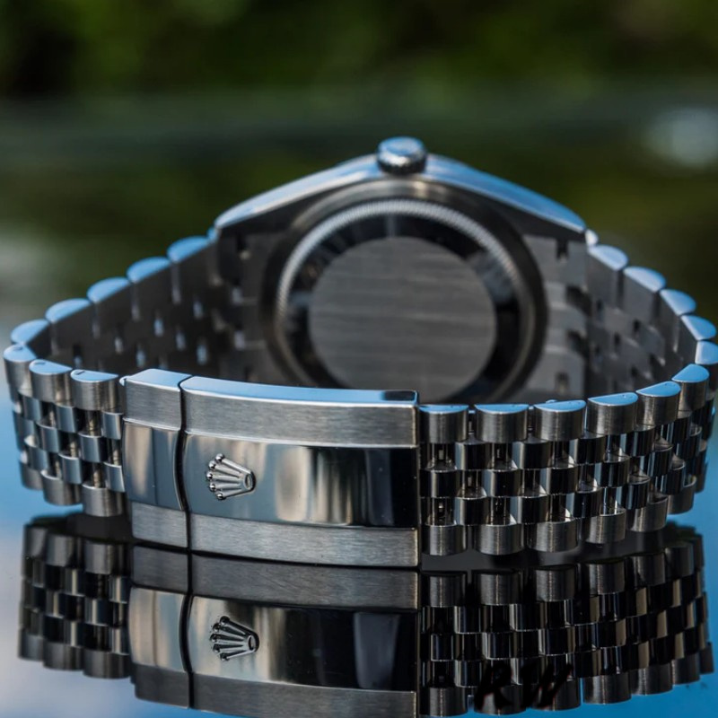 Rolex Datejust 126234 Fluted Bezel Blue Fluted Motif Dial 36MM Unisex Watch features a 36mm stainless steel case, Polished solid white gold fluted fixed bezel ,It features a blue fluted-motif dial with index hour markers,scratch-resistant sapphire crystal ,Date window displayed under cyclops lens at 3 o'clock with instantaneous date setting. Jubilee bracelet with five-piece links, folding Oysterclasp buckle with Easylink comfort extension link.