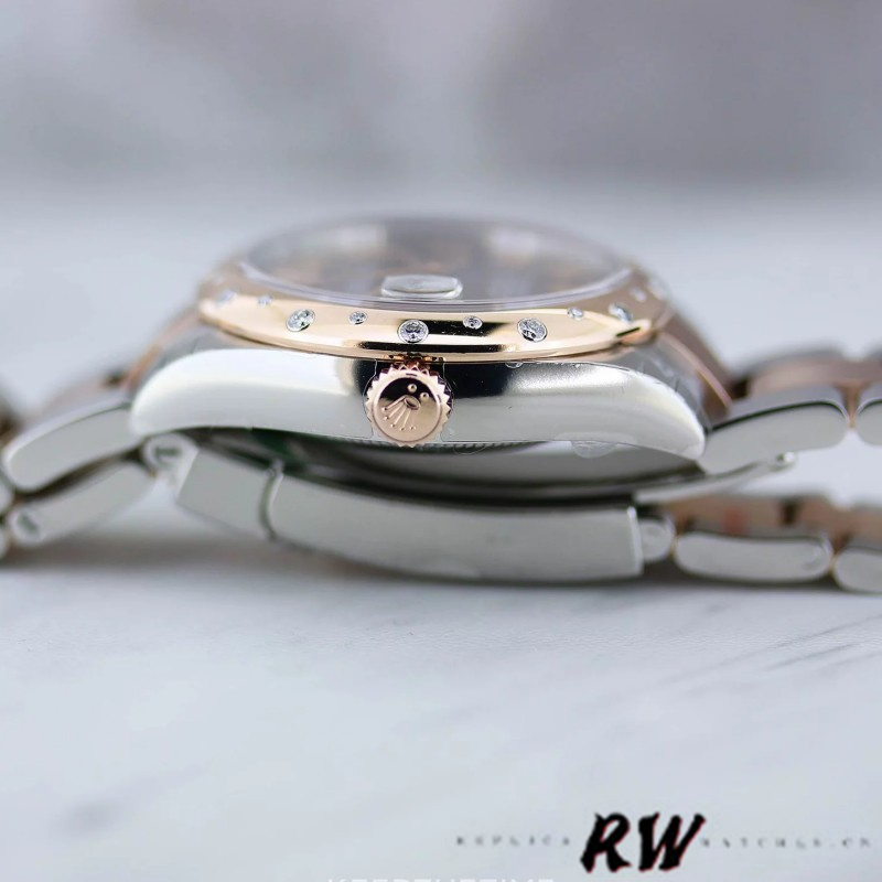 Rolex Datejust 178341 Chocolate Brown Roman Numeral Dial 31MM Lady Watch, features 31MM rose gold and stainless steel,Chocolate Brown dial with Roman numeral hour markers,rose gold domed bezel with 24 scattered diamonds. Engraved inner bezel. sapphire crystal glass,diamond Roman numeral at 6 o'clock position. Date calendar at 3 o'clock aperture.Comes on 2-tone with a stainless steel and rose gold bracelet finished with a folding clasp.