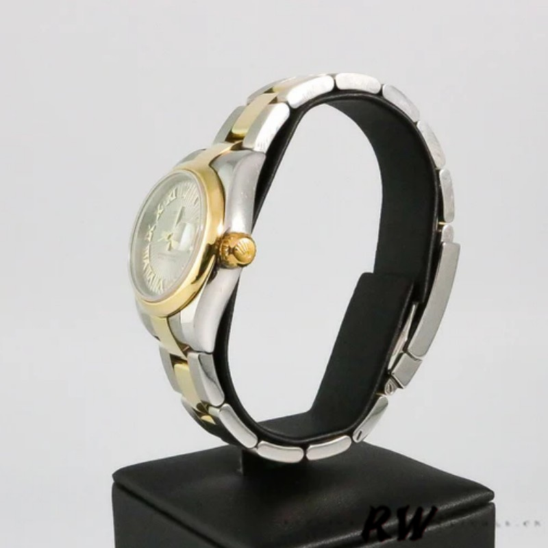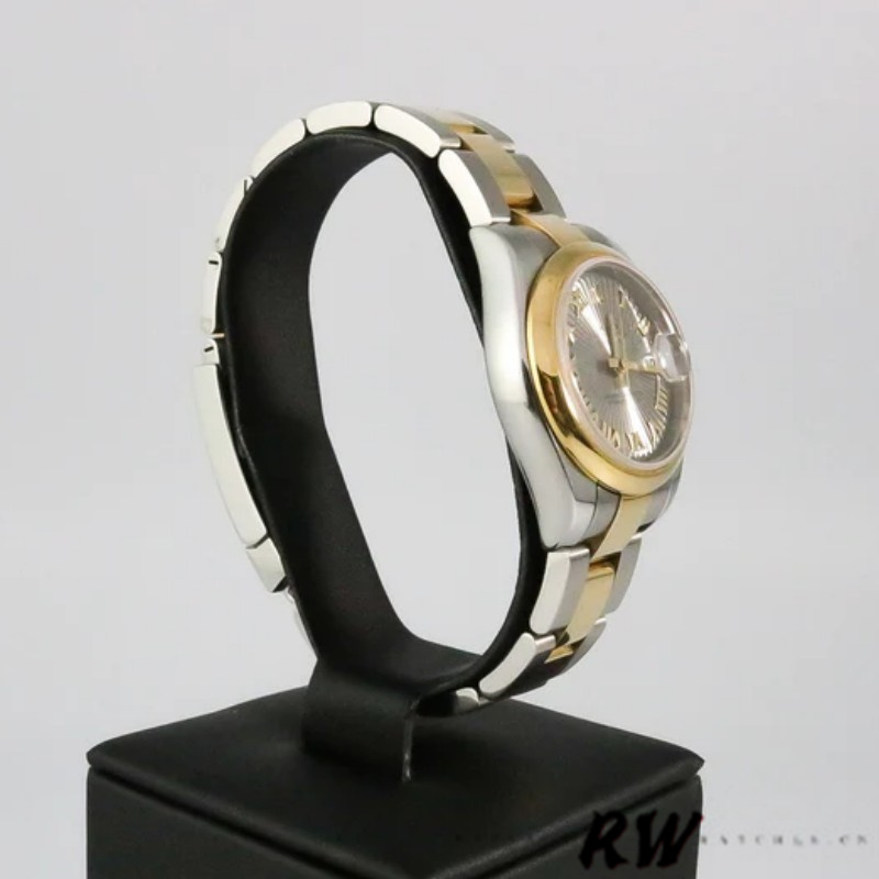 Rolex Datejust 179163 Sunbeam Gray Dial Domed Dezel 26MM Lady Watch,26MM Stainless steel yellow gold case, Domed bezel.Sunbeam Gray Dial with Roman Numbers Hour Markers.Date display at the 3 o'clock position.Scratch resistant sapphire crystal. Screw down crown.The reliable Yellow Gold and Stainless Steel Oyster Bracelet will look great on your wrist.