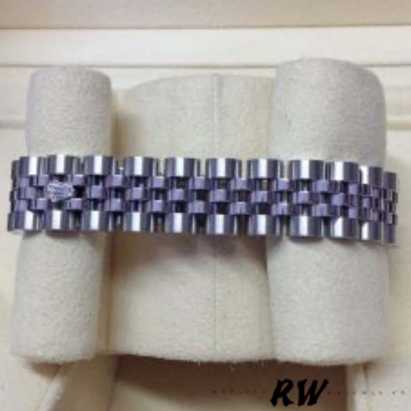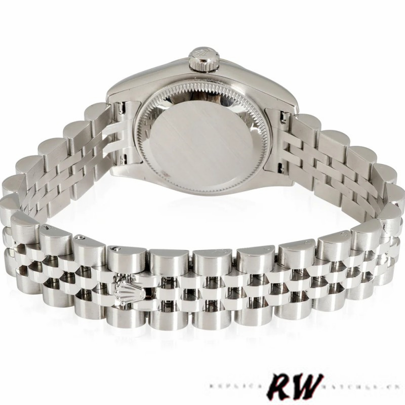 Rolex Datejust 179174 Black Roman Dial Fluted Bezel 26MM Lady Watch, 26mm Stainless steel oyster case in diameter. White gold fluted bezel. Scratch resistant sapphire crystal with cyclops magnifier.Black Dial with Roman Numeral Markers. Date calendar at 3 o'clock aperture. Stainless steel jubilee bracelet with a hidden clasp.