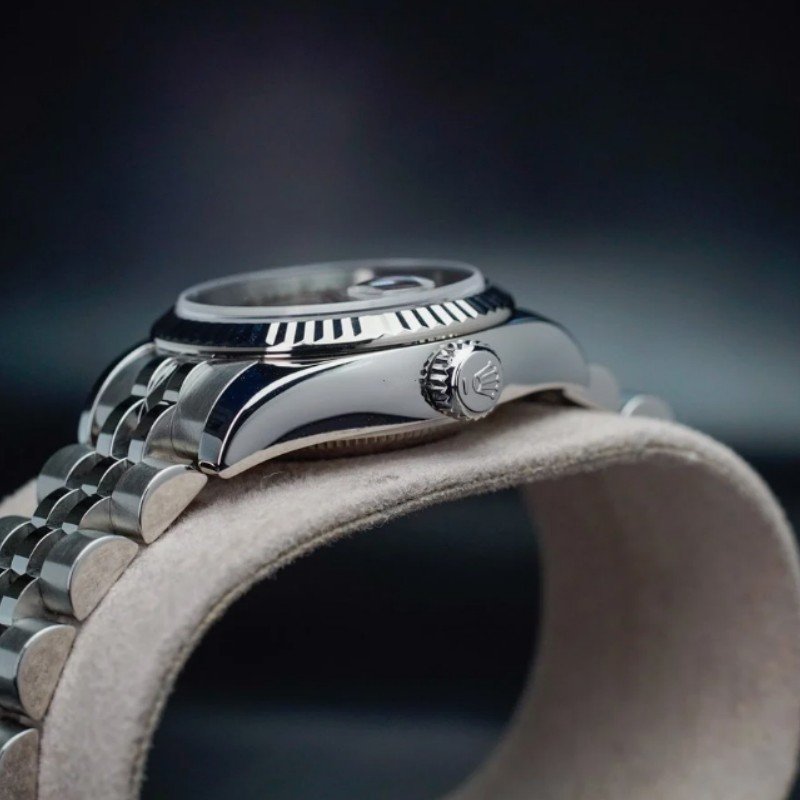 Rolex Datejust 179174 Dark Mother Of Pearl Dial Fluted Bezel 26MM Lady Watch, 26mm Stainless steel oyster case in diameter. White gold fluted bezel. Scratch resistant sapphire crystal with cyclops magnifier.Dark Mother Of Pearl Dial with Roman Numeral Markers. Date calendar at 3 o'clock aperture. Stainless steel jubilee bracelet with a hidden clasp.