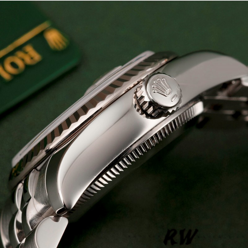 Rolex Datejust 179174 Mother of Pearl Pink White Dial Fluted Bezel 26MM Lady Watch, 26mm Stainless steel oyster case in diameter. White gold fluted bezel. Scratch resistant sapphire crystal with cyclops magnifier.Mother of Pearl pink Dial with Roman Numeral Markers. Date calendar at 3 o'clock aperture. Stainless steel jubilee bracelet with a hidden clasp.