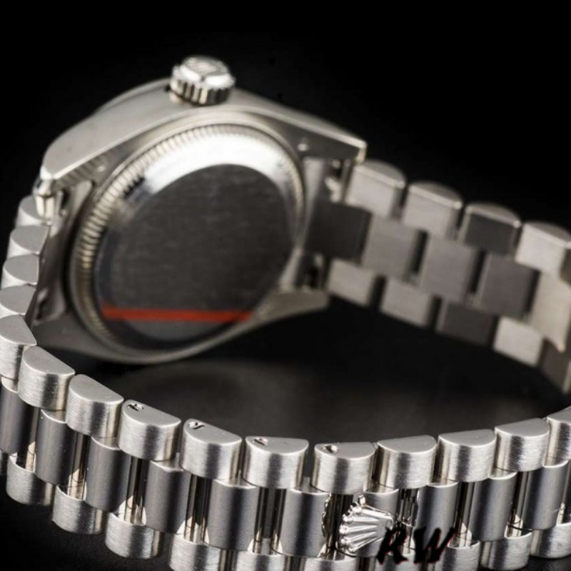 Rolex Datejust 179179 Pink Dial Fluted Bezel 26MM Lady Watch,26mm white gold oyster case in diameter. White gold fluted bezel. Scratch resistant sapphire crystal with cyclops magnifier.Pink dial with diamond hour markers. Date calendar at 3 o'clock aperture. White gold president bracelet with hidden clasp.