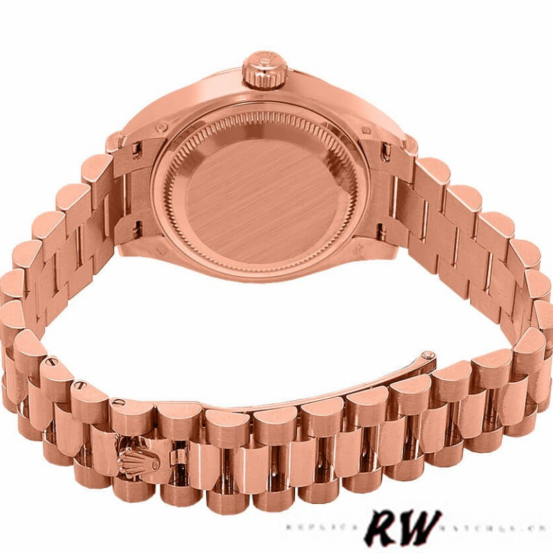 Rolex Datejust 279175 Olive Green Diamonds Dial Fluted Bezel 28mm Lady Watch, has a Rose Gold 28 mm Round Case with Screw Down Crown and a Rose Gold Fluted Bezel.Olive Green dial with Diamonds hour markers.Date calendar at 3 o'clock aperture. Everose gold President bracelet with semi-circular three-piece links, concealed folding Crownclasp buckle.