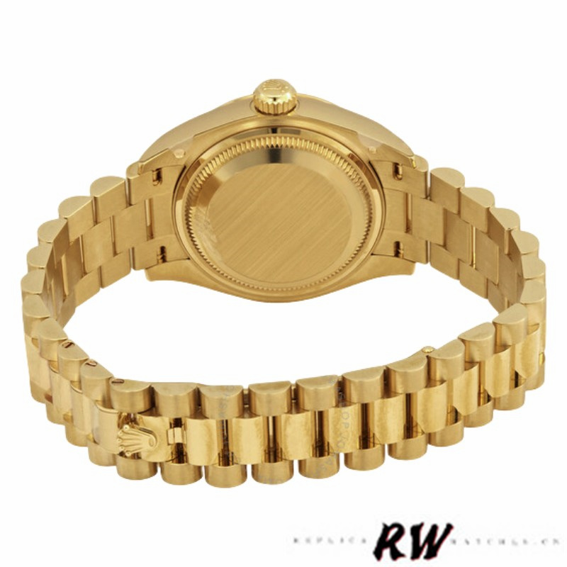 Rolex Datejust 279178 Mint Green Diamond Dial Fluted Bezel 28mm Lady Watch, has a yellow gold 28 mm Round Case with Screw Down Crown and a yellow gold Fluted Bezel.Mint Green dial with Diamond hour marker. Date Window Displayed at 3 O'Clock,Yellow gold President bracelet with semi-circular three-piece links, concealed folding Crownclasp buckle.