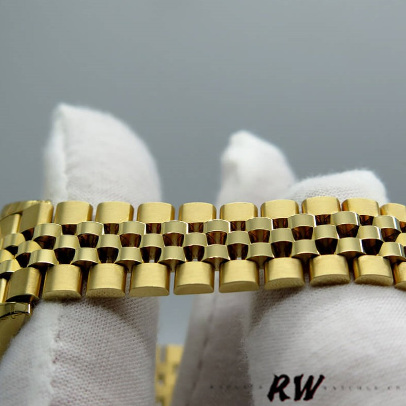 Rolex Datejust 279178 Silver Diamond Dial Fluted Bezel 28mm Lady Watch, has a yellow gold 28 mm Round Case with Screw Down Crown and a yellow gold Fluted Bezel.Silver dial with Diamond hour marker. A Diamond-filled Roman numeral IX at the 9 o'clock position.Yellow gold President bracelet with semi-circular three-piece links, concealed folding Crownclasp buckle.