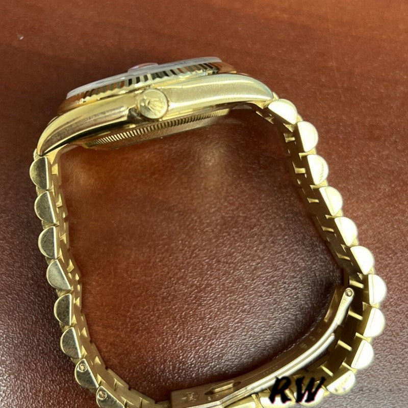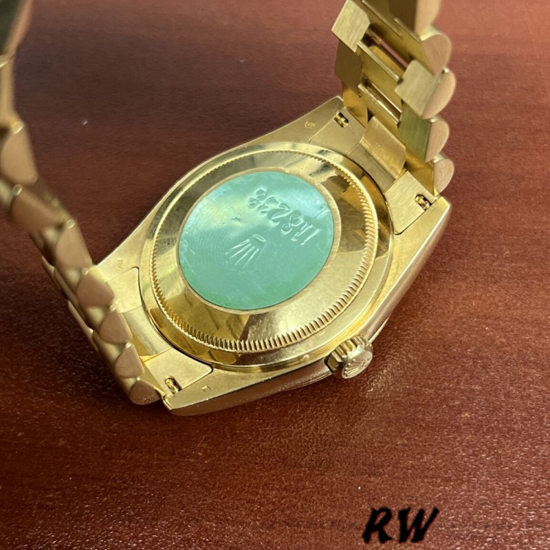 Rolex Day Date 118238 Black Diamond Dial 36mm Mens Watch features a 36mm yellow gold case surrounding a black diamond dial with Sweep center seconds. Outer minute and 1/2 seconds divisions, aperture for day at 12, aperture for date at 3.The presence of a yellow gold Presidential semi-circular link bracelet with concealed folding Crownclasp and matching fluted bezel.