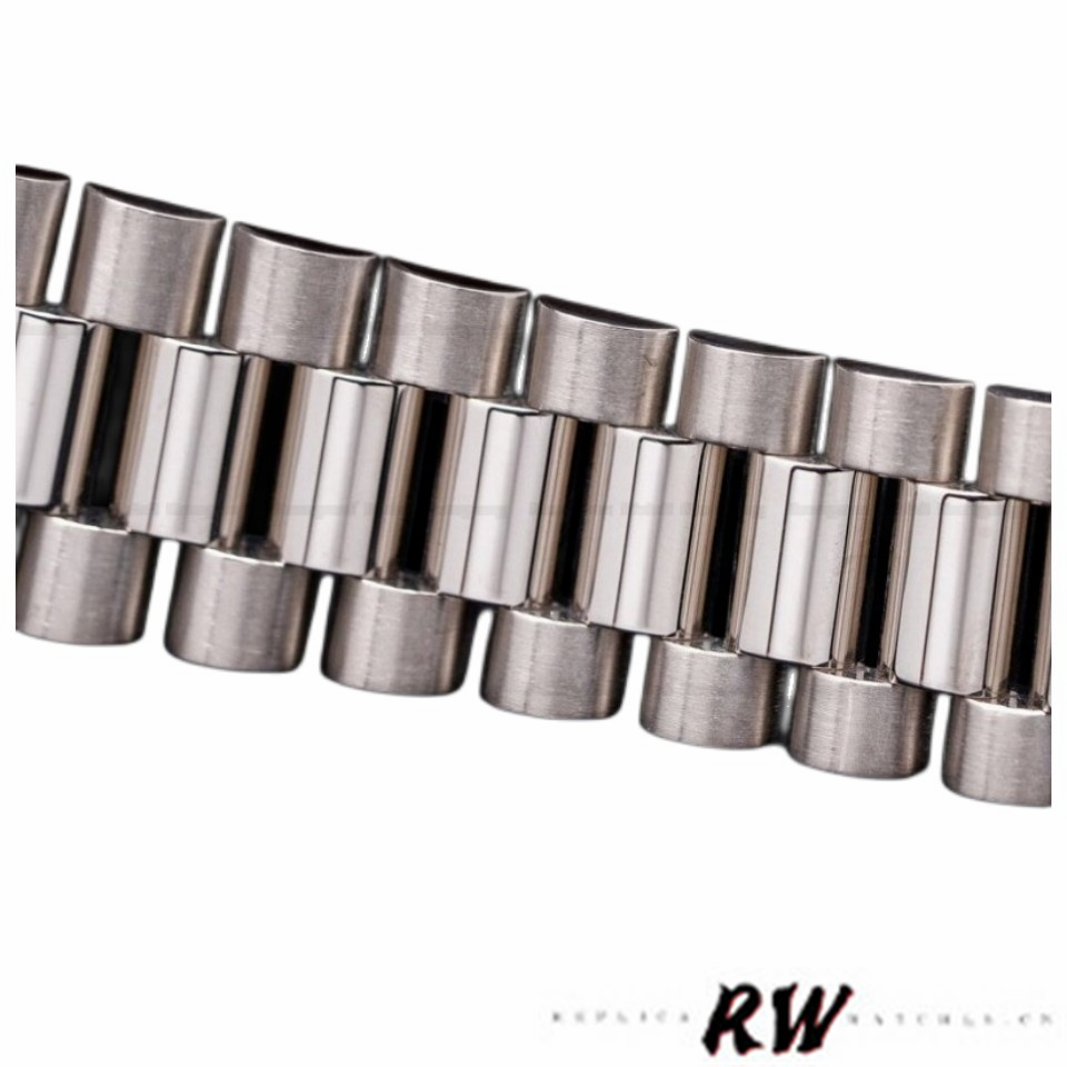 Rolex Day Date 118339 White Dial Fluted Bezel 36mm Unisex Watch has a White Gold 36 mm Round Case with Screw Down Crown and a White Gold Fluted Bezel. Diamond lugs on a white gold presidential bracelet with a glossy white dial with applied white gold Roman indices,date at 3 o'clock, day at 12, The reliable White Gold Oyster Bracelet will look great on your wrist.