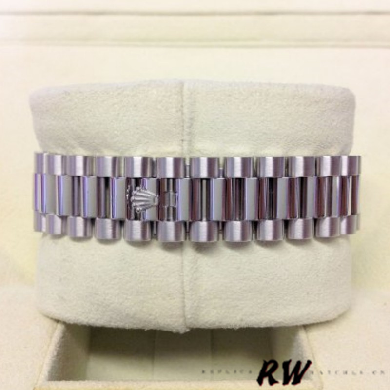 Rolex Day Date 118346 Ice Blue Dial 36mm Unisex Watch. 36mm Polished platinum case featuring an ice blue diamond dot dial.The dial is surrounded by a factory set round brilliant cut diamond bezel,Day of the week window displayed at the 12 o'clock position.Date window displayed at the 3 o'clock position with a cyclops magnifying lens.The reliable White Gold Oyster Bracelet will look great on your wrist.