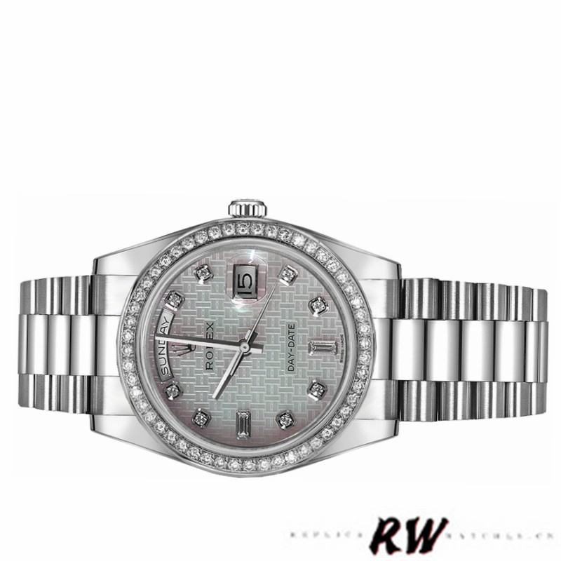 Rolex Day Date 118346 Oxford Motif Diamond Dial 36mm Unisex Watch. 36mm Polished platinum case featuring Oxford Motif Mother of Pearl Platinum Dial Set with Diamonds, 8 round and 2 baguette cut diamond hour markers.The dial is surrounded by set round brilliant cut diamond bezel,Day of the week window displayed at the 12 o'clock position.Date window displayed at the 3 o'clock position with a cyclops magnifying lens.The elegantly designed Platinum with Concealed Folding Crownclasp will look great on your wrist.