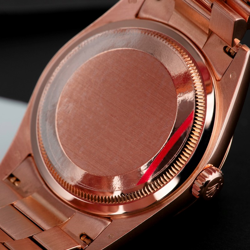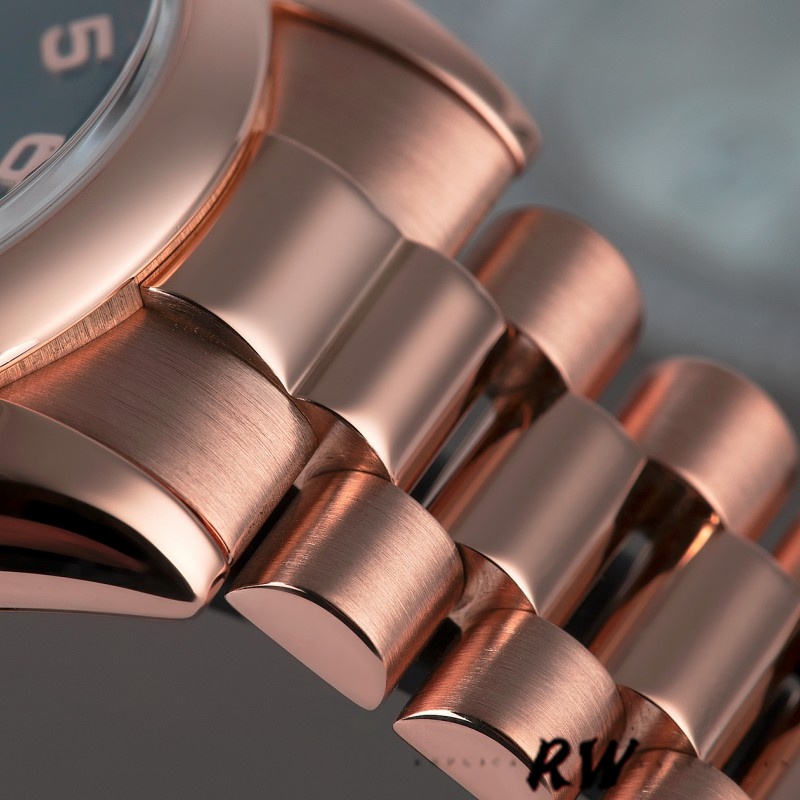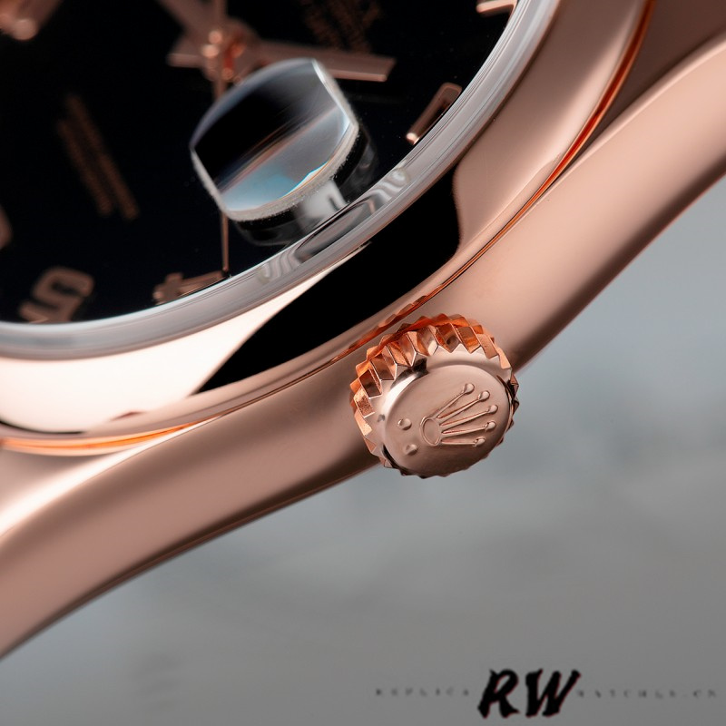 Rolex Day-Date 118205 Black Arabic Dial 36mm Unisex Watch. 36 mm Round case shape.Fixed - domed everose gold bezel. Black dial with rose-gold tone hands and Arab numeral hour markers. Minute markers around the outer rim. Dial Type: Analog. Date display at 3 o'clock; day display at 12 o'clock. Scratch resistant sapphire crystal. Screw down crown.Brushed with Polished Solid Everose Gold Oyster Bracelet.