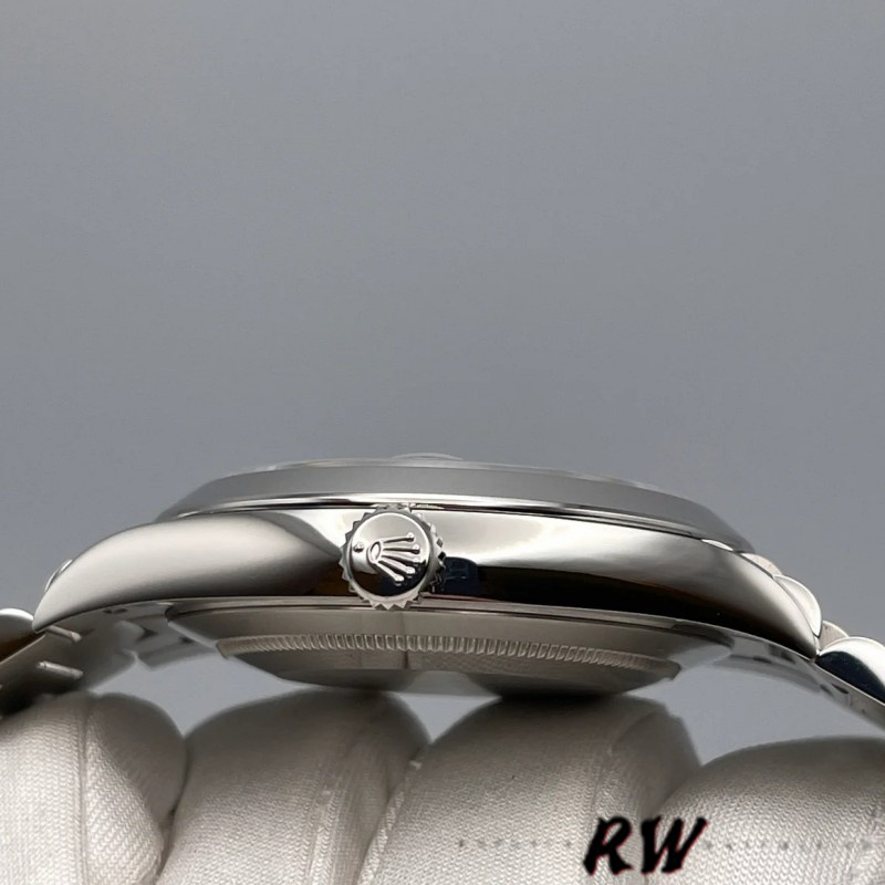 Rolex Day-Date 118206 Ice Blue Roman Numeral Dial 36mm Unisex Watch. With a silver-blue dial and gold Roman numerals place hour markers on the President bracelet.The platinum version with a smooth bezel is perfect for small men's or women's wrists as it has a 36mm case. The day of the week at 12 o'clock, which is written in full in any language of the world, is a feature of these watches, This bracelet is available only in precious metals and has 3 rows of smooth, flat links that will never damage the cuffs of a shirt.