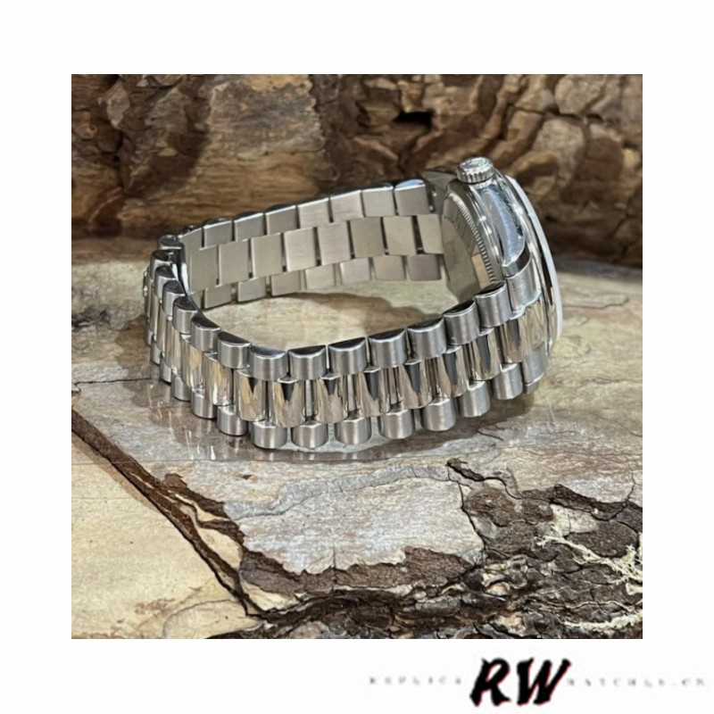 Rolex Day-Date 118206 Rhodium Grey Dial Roman Numerals 36mm Unisex Watch. Rhodium Grey Dial with Roman Numerals place hour markers on the President bracelet.The platinum version with a smooth bezel is perfect for small men's or women's wrists as it has a 36mm case. The day of the week at 12 o'clock, which is written in full in any language of the world, is a feature of these watches, This bracelet is available only in precious metals and has 3 rows of smooth, flat links that will never damage the cuffs of a shirt.
