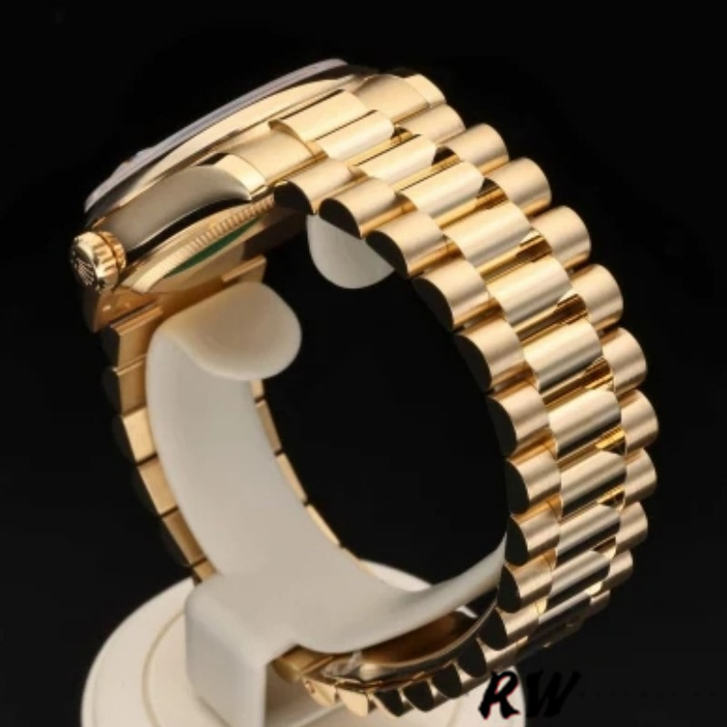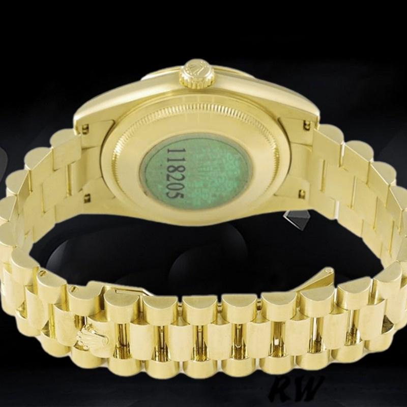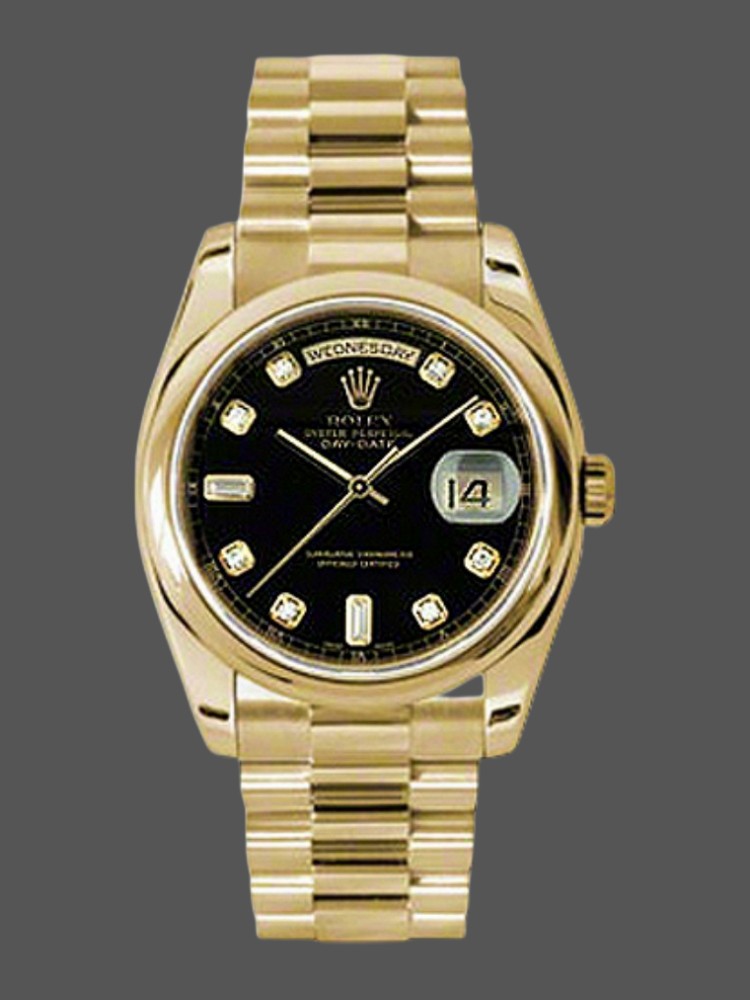 Rolex Day-Date 118208 Black Diamond Dial 36mm Unisex Watch. 36mm yellow gold case with a yellow gold Rolex president bracelet. Fixed domed yellow gold bezel. Black dial with gold-tone hands and Diamonds numeral hour markers. Minute markers around the outer rim. Date display at the 3 o'clock position. Day of the week display centered on the 12 o'clock position. Scratch resistant sapphire crystal. Screw down crown. Solid case back. Round case shape.