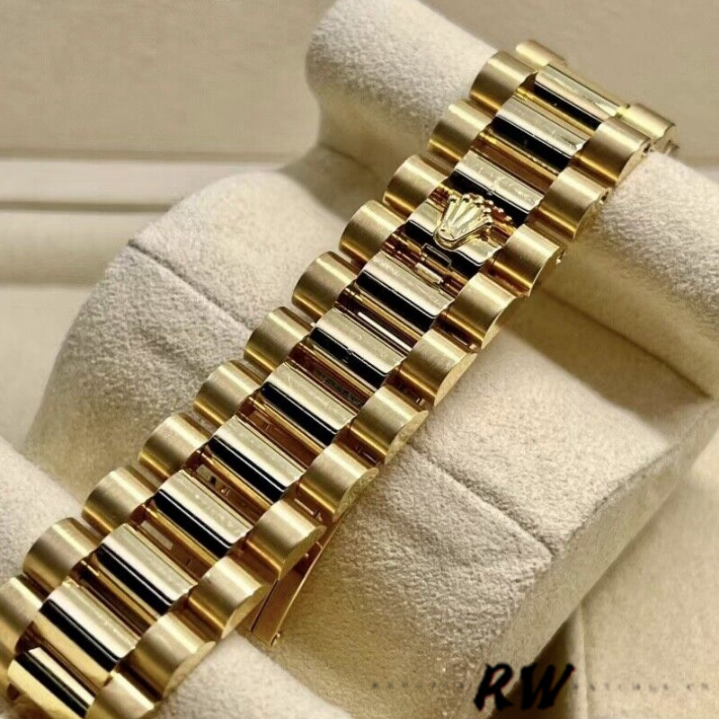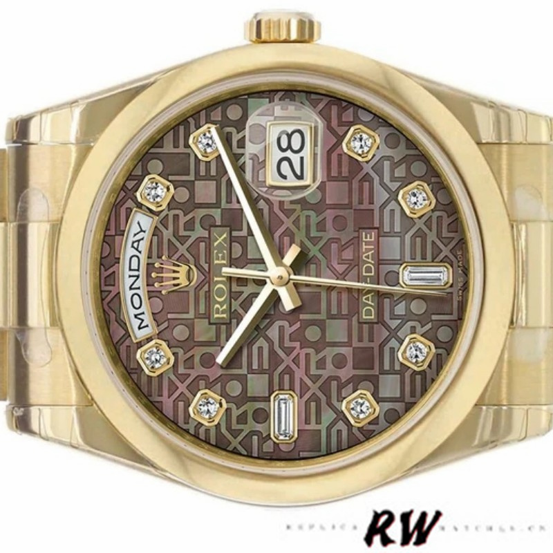 Rolex Day-Date 118208 Black MOP Diamond Dial 36mm Unisex Watch .36mm yellow gold case with a yellow gold Rolex president bracelet. Fixed domed yellow gold bezel. Black Mother of pearl dial with gold-tone hands and Diamonds numeral hour markers. Minute markers around the outer rim.Date display at the 3 o'clock position. Day of the week display centered on the 12 o'clock position. Scratch resistant sapphire crystal. Screw down crown. Solid case back. Round case shape.