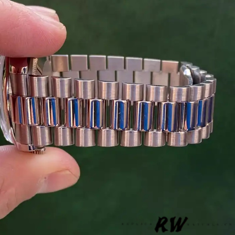 Rolex Day-Date 118209 Oyster Bracelet White Dial 36mm Unisex Watch. 36mm white gold case, white gold case back and white gold bracelet. As normal for a Day Date, it includes a magnification cyclops on the sapphire crystal at 3 o��clock and the day window at 12 o��clock, which can be adjusted through a quickset. The white dial With Manufacturer Serial Numbers . The President style bracelet includes an invisible folding clasp.