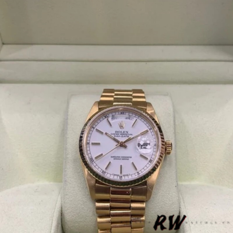Rolex Day-Date 118235 White Dial 36mm Unisex Watch has a Rose Gold 36 mm Round Case with Screw Down Crown and a Rose Gold Fluted Bezel. white dial With Manufacturer Serial Numbers. The day at the 12 o'clock and the date at the 3 o'clock.Rose Gold President Bracelet with the heavy band Folding Crownclasp.