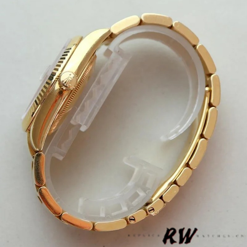 Rolex Day-Date 118238 Black MOP Diamond Dial 36mm Unisex Watch.36mm yellow gold case.Polished yellow gold fluted bezel and President Bracelet.Black Mother-of-pearl Jubilee dial with yellow gold-tone hands and diamond hour markers. 8 round and 2 baguette shaped diamond hour markers.Day of the week window displayed at the 12 o'clock position.Date window displayed at the 3 o'clock position with a cyclops magnifying lens.