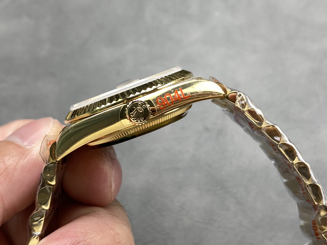 Rolex Day-Date 118238 Champagne Dial 36mm Unisex Watch.36mm yellow gold case with a yellow gold rolex president bracelet. Fixed fluted yellow gold bezel. Champagne dial with yellow gold-tone hands and Roman numeral hour markers. Minute markers around the outer rim.Date display at 3 o'clock; day display at 12 o'clock.Scratch resistant sapphire crystal. Screw down crown. Solid case back.