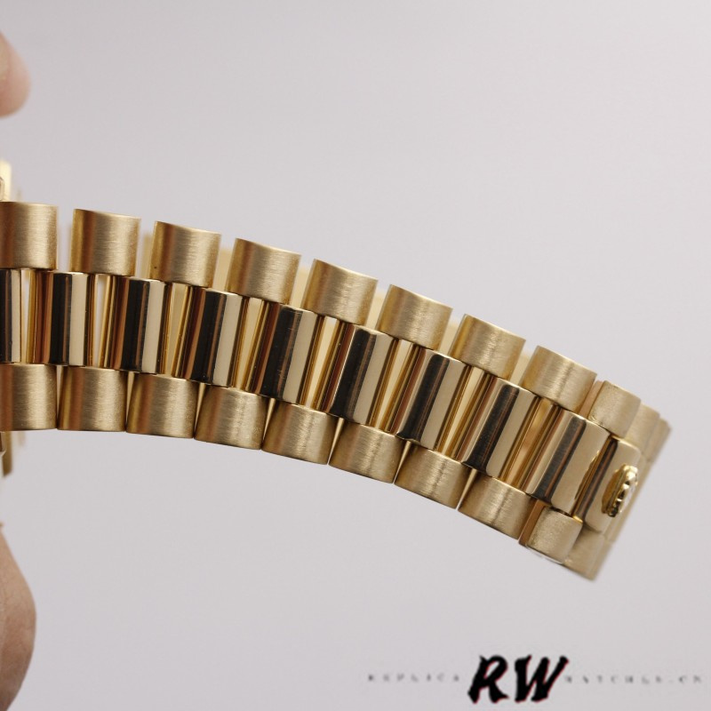 Rolex Day-Date 118238 Ivory Dial Fluted Bezel 36mm Unisex Watch has a Yellow Gold 36 mm Round Case with Screw Down Crown and a Yellow Gold Fluted Bezel. Roman Numeral Pyramid Ivory Dial With Manufacturer Serial Numbers,and day and date display at 12 and 3 o'clock. Scratch resistant sapphire crystal. Screw down crown.The reliable Yellow Gold Oyster Bracelet will look great on your wrist.