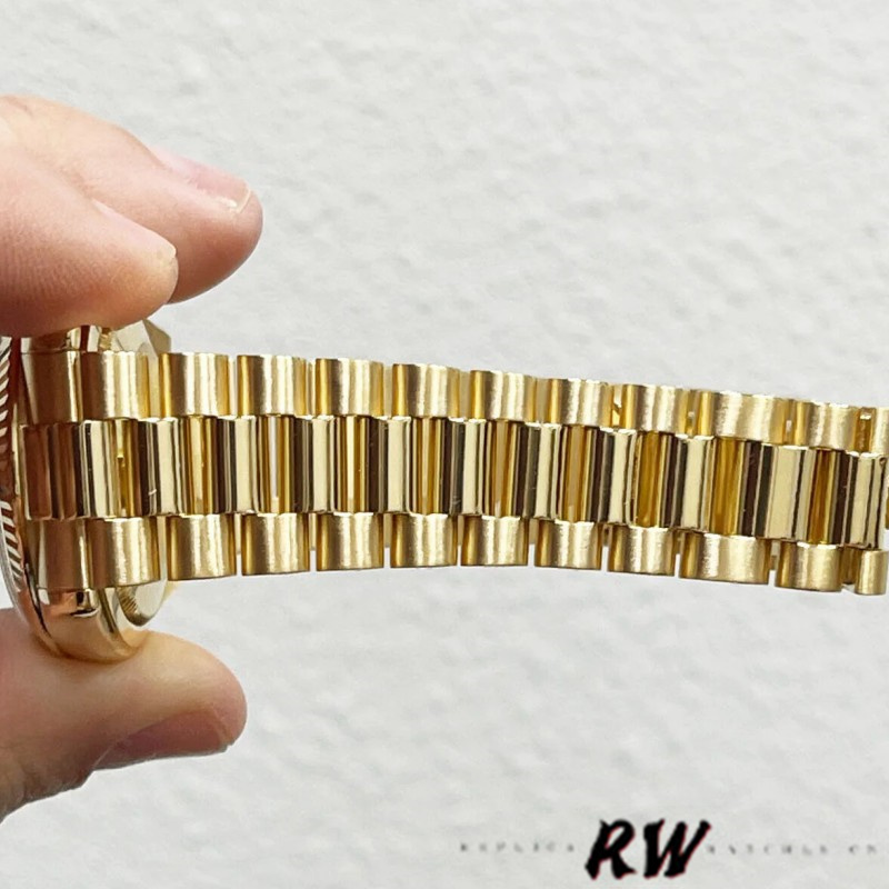 Rolex Day-Date 118238 Silver Diamond Dial 36mm Unisex Watch has a Yellow Gold 36 mm Round Case with Screw Down Crown and a Yellow Gold Fluted Bezel. Featuring a silver diamond dot dial housing an external Cyclops date aperture at 3 O'clock and a day aperutre in-between 11 and 1 O'clock surrounded , polished finish shoulders and case sides.Scratch resistant sapphire crystal. Screw down crown.The reliable Yellow Gold Oyster Bracelet will look great on your wrist.