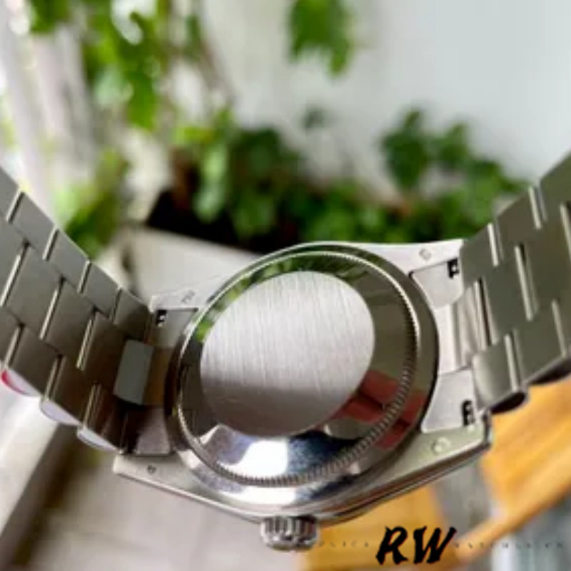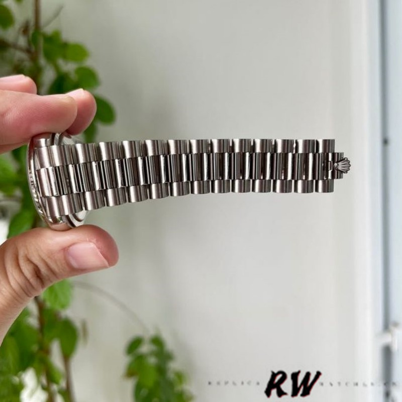 Rolex Day-Date 118239 MOP Black Dial 36mm Unisex Watch. 36mm white gold case with white gold fluted bezel.Mother of Pearl Black Dial Set with Diamonds, Date display at 3 o'clock position and day display at 12 o'clock position with a cyclops magnifying lens. White gold Oyster bracelet, hidden deployant clasp. Sapphire crystal. White gold case back.