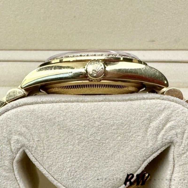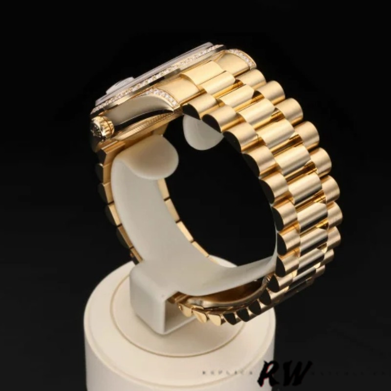 Rolex Day-Date 118388 Black Diamond Dial 36mm Unisex Watch features a 36mm Diamond set yellow gold case fitted with a diamond set black dial, Diamond-encrusted lugs, a matching diamond bezel, Scratch resistant sapphire crystal with cyclops magnifier. Day of the week window displayed at the 12 o'clock position.Date window displayed at the 3 o'clock position.The elegantly designed with Concealed Folding Crownclasp will look great on your wrist.
