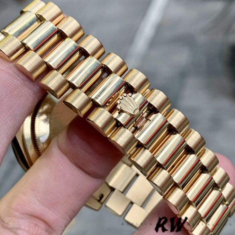 Rolex Day-Date 118388 Bull's Eye Brown Dial 36mm Unisex Watch features a 36mm Diamond set yellow gold case fitted with Bull's Eye Brown Dial Set with Diamonds, Diamond-encrusted lugs, a matching diamond bezel, hour and minute hands, Scratch resistant sapphire crystal with cyclops magnifier. Day of the week window displayed at the 12 o'clock position.Date window displayed at the 3 o'clock position.The elegantly designed with Concealed Folding Crownclasp will look great on your wrist.