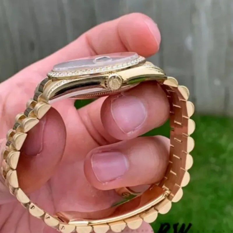 Rolex Day-Date 118388 Yellow Gold White Dial 36MM Unisex Watch features a 36mm Diamond set yellow gold case,White Dial with Index Hour Markers, Diamond-encrusted lugs, a matching diamond bezel, hour and minute hands, Scratch resistant sapphire crystal with cyclops magnifier. Day of the week window displayed at the 12 o'clock position.Date window displayed at the 3 o'clock position.The elegantly designed with Concealed Folding Crownclasp will look great on your wrist.