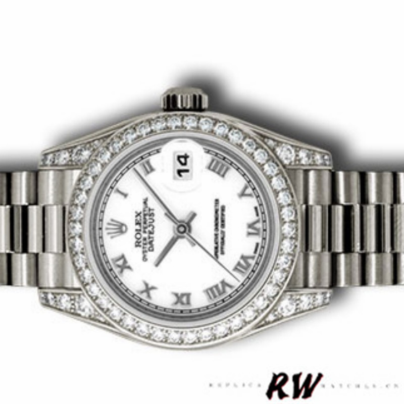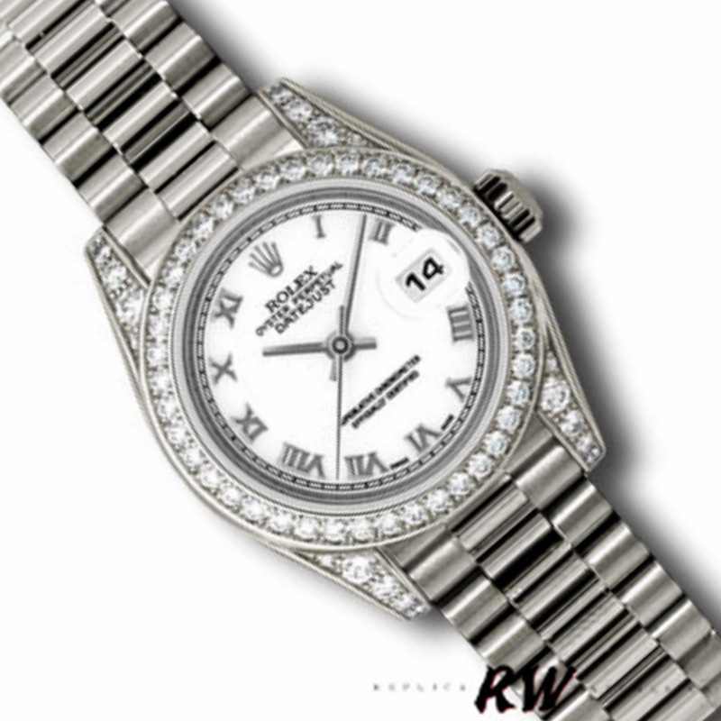 Rolex Day-Date 118389 White Gold White Roman Numeral Dial 36MM Unisex Watch features a 36mm white gold case ,White Dial with Roman Numeral Hour Markers with Diamonds Set on Bezel and Lugs, Scratch resistant sapphire crystal with cyclops magnifier. Day of the week window displayed at the 12 o'clock position.Date window displayed at the 3 o'clock position.White gold Presidential bracelet with folding buckle.