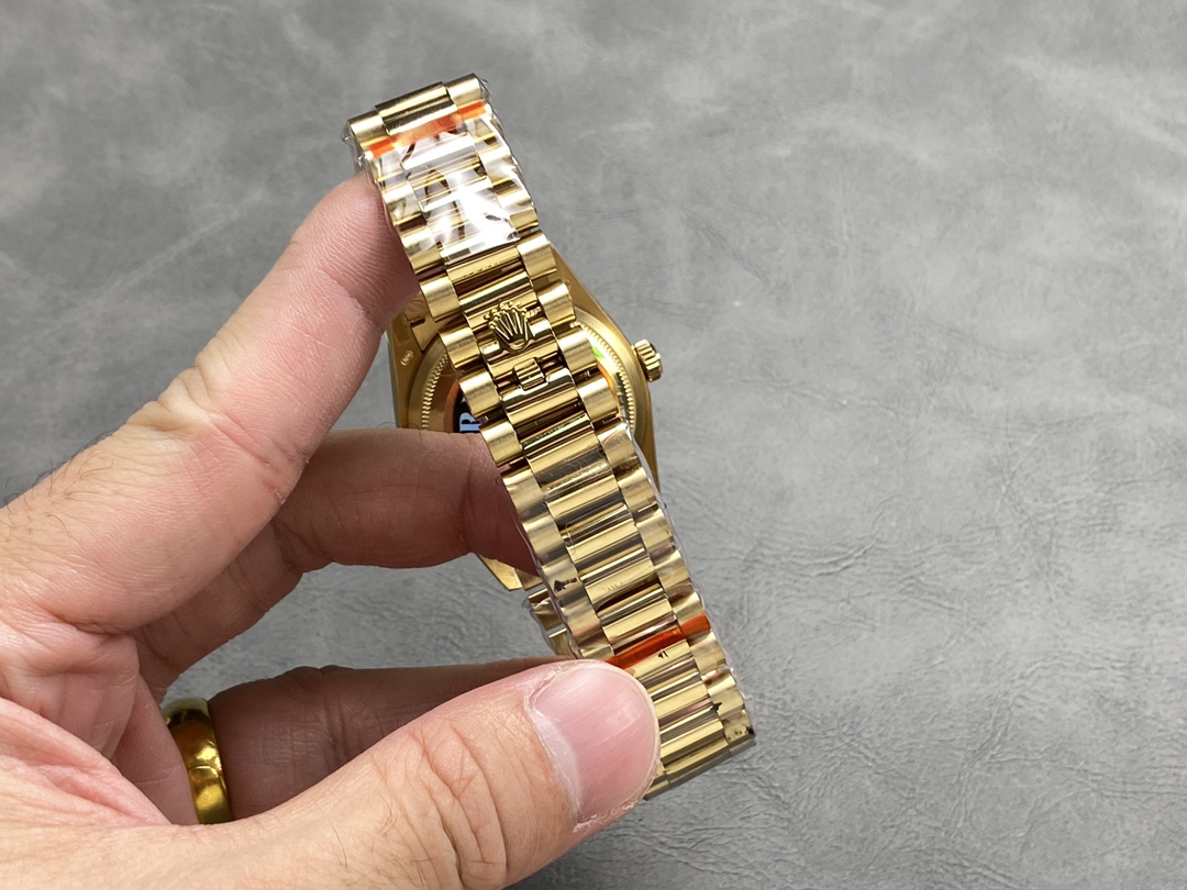 Rolex Day-Date 128238 Fluted Bezel Champagne Diamond Dial 36MM Watch,36mm yellow gold case, screw-down back, screw-down crown with twinlock double waterproofness system, fluted bezel, Champagne dial with diamond hour markers. Date window displayed under cyclops lens at 3 o'clock. Day window displayed at 12 o'clock.Instantaneous day and date setting.Yellow gold President bracelet with semi-circular three-piece links, concealed folding Crownclasp buckle.