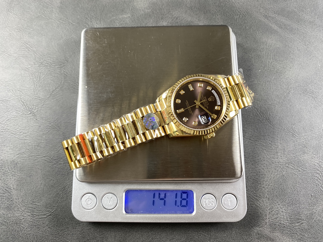Rolex Day-Date 128238 Fluted Bezel Dark Grey Dial 36MM Watch,36mm yellow gold case, screw-down back, screw-down crown with twinlock double waterproofness system, fluted bezel,Dark Grey Dial with Diamond Hour Markers.Date window displayed under cyclops lens at 3 o'clock. Day window displayed at 12 o'clock.Instantaneous day and date setting.Yellow gold President bracelet with semi-circular three-piece links, concealed folding Crownclasp buckle.
