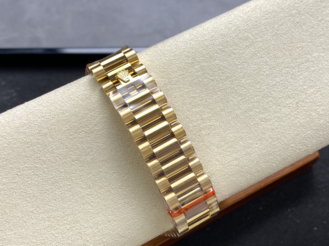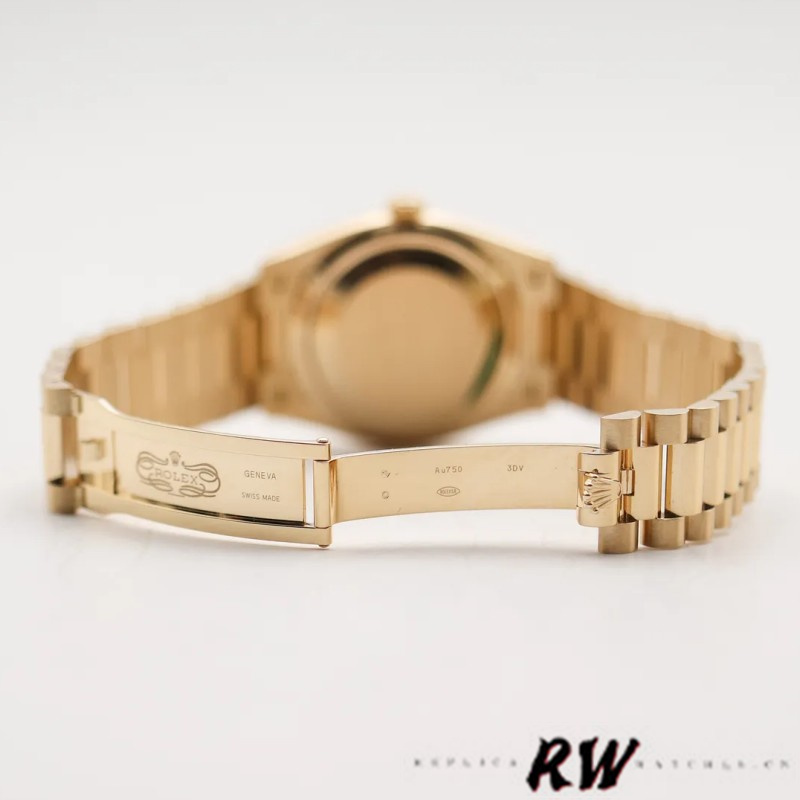 Rolex Day-Date 128238 Fluted Bezel Turquoise Diamond Dial 36MM Unisex Watch,36mm yellow gold case, screw-down back, screw-down crown with twinlock double waterproofness system, fluted bezel, Turquoise dial with index and Roman numeral diamond hour markers. Date window displayed under cyclops lens at 3 o'clock. Day window displayed at 12 o'clock. Instantaneous day and date setting.Yellow gold President bracelet with semi-circular three-piece links, concealed folding Crownclasp buckle.