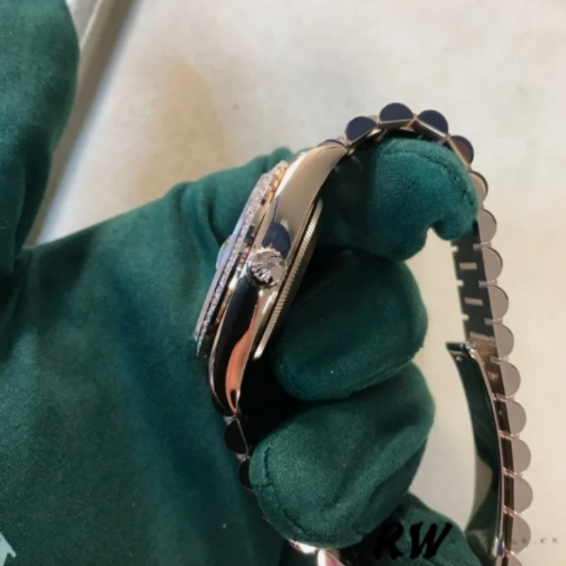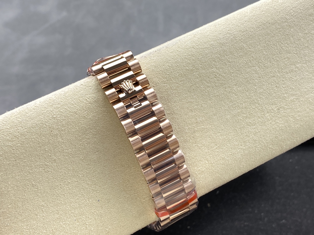 Rolex Day-Date 128345RBR Slate Dial Everose Gold 36MM Unisex Watch,36mm Everose gold case, screw-down back, screw-down crown with twinlock double waterproofness system, bezel set with diamonds, Date window displayed under cyclops lens at 3 o'clock. Day window displayed at 12 o'clock,slate dial with diamond hour markers and baguette-cut diamonds at 6 and 9 o'clock.Everose gold President bracelet with semi-circular three-piece links, concealed folding Crownclasp buckle.