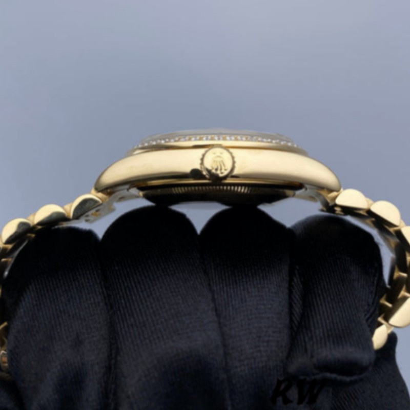 Rolex Day-Date 128348RBR Champagne Diamond Dial Yellow Gold 36MM Unisex Watch, 36mm yellow gold case, screw-down back, screw-down crown with twinlock double waterproofness system, bezel set with 52 diamonds, scratch-resistant sapphire crystal with cyclops lens over the date, Champagne Diamond Dial with diamond hour markers,The symbolic yellow gold presidential bracelet includes semi-circular three-piece links and concealed Crownclasp, being the most sought-out timepiece to date.