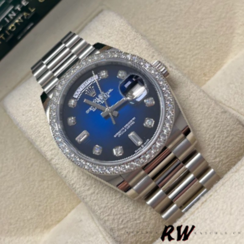 Rolex Day-Date 128349RBR Blue Ombre Dial Diamond Bezel 36MM Unisex Watch,36mm white gold case, screw-down back, screw-down crown with twinlock double waterproofness system, bezel set with diamonds, Blue Ombre dial with diamond hour markers. Day window displayed at 12 o'clock. Date window displayed under cyclops lens at 3 o'clock,White gold President bracelet with semi-circular three-piece links, concealed folding Crownclasp buckle.