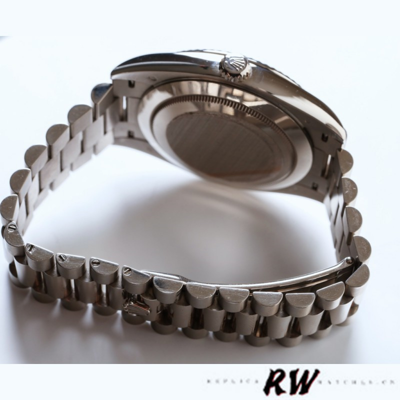 Rolex Day-Date 228206 Blue Roman Numeral Dial Platinum 40MM Mens Watch,has a 40mm Platinum case that has a solid case back with Screw Down Crown and smooth platinum bezel.Scratch resistant sapphire crystal with Cyclops magnifier.Blue Dial with Roman Numeral Hour Markers,Date Window Displayed at 3 O'Clock,Day Window Displayed at 12 O'Clock,Platinum three-piece-link Presidential bracelet with a fold-over clasp.