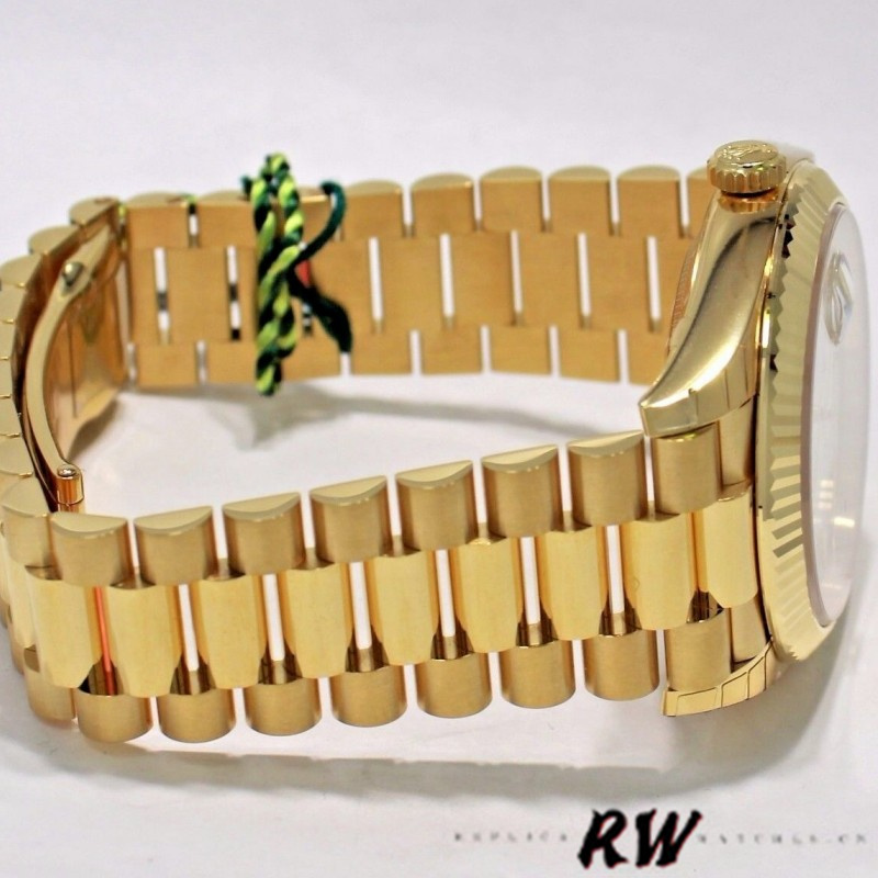 Rolex Day-Date 228238 Black Diagonal Motif Dial Fluted Bezel 40mm Mens Watch, featuring a 40mm Yellow Gold case, solid case back with screw-down crown and fluted bezel. Scratch-resistant sapphire crystal with Cyclops magnifying glass.Black Diagonal Motif Dial with Index Hour Markers, date window at 3 o'clock, day of the week window at 12 o'clock,Yellow Gold three-piece presidential bracelet with deployant clasp.
