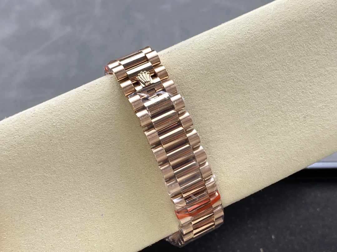 Rolex Day-Date 228345RBR Sundust Diamond Dial Diamond Bezel 40mm Mens Watch, featuring a 40mm Everose Gold case, solid case back with screw-down crown and Diamond Bezel. Scratch-resistant sapphire crystal with Cyclops magnifying glass.Sundust Dial Diamond Hour Markers, date window at 3 o'clock, day of the week window at 12 o'clock,Everose Gold three-piece presidential bracelet with deployant clasp.