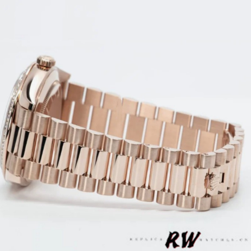 Rolex Day-Date 228345RBR Chocolate Brown Diamond Dial Diamond Bezel 40mm Mens Watch, featuring a 40mm Everose Gold case, solid case back with screw-down crown and Diamond Bezel. Scratch-resistant sapphire crystal with Cyclops magnifying glass.Chocolate Brown Dial Diamond Hour Markers, date window at 3 o'clock, day of the week window at 12 o'clock,Everose Gold three-piece presidential bracelet with deployant clasp.