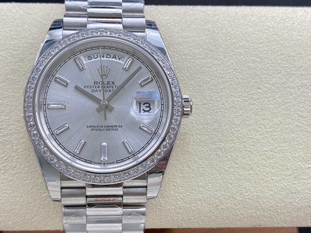 Rolex Day-Date 228349RBR Silver Dial Diamond Bezel 40mm Mens Watch, featuring a 40mm White Gold case, solid case back with screw-down crown and Diamond Bezel. Scratch-resistant sapphire crystal with Cyclops magnifying glass.Silver Dial Diamond Hour Markers, date window at 3 o'clock, day of the week window at 12 o'clock,White Gold three-piece presidential bracelet with deployant clasp.