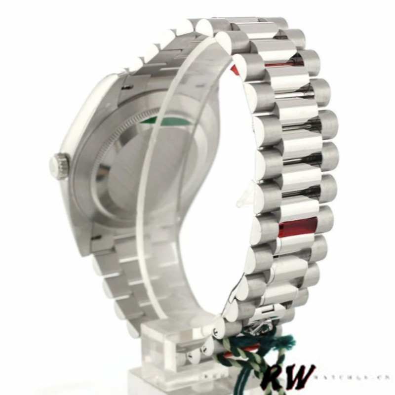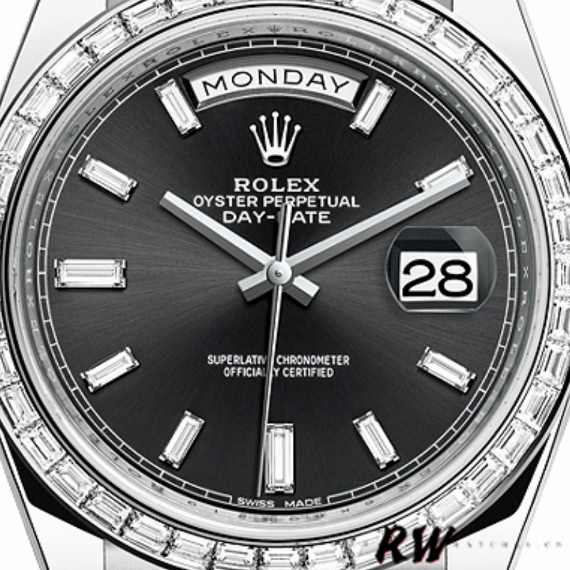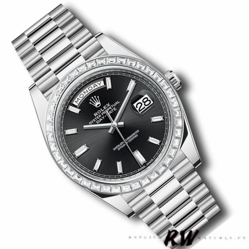 Rolex Day-Date 228396TBR Black Dial Diamond Bezel 40mm Mens Watch, featuring a 40mm platinum case, solid case back with screw-down crown and Diamond Bezel. Scratch-resistant sapphire crystal with Cyclops magnifying glass.Black Dial with Index Hour Markers, date window at 3 o'clock, day of the week window at 12 o'clock,Polished platinum President bracelet with Concealed folding Crownclasp deployment buckle.
